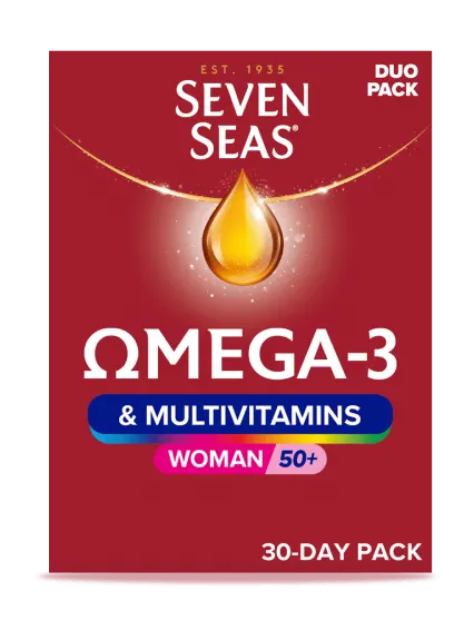 Seven Seas Omega-3 & Multivitamins Woman 50+. More than a Multivitamin – this multivitamin tablet has been specially formulated for women 50 and over by adding Vitamin B12 for Tiredness and Fatigue⁴ and Calcium for Bones⁴ – with a capsule containing UK’s N.1 Omega-3** that support healthy Heart¹, Brain² and Vision³.